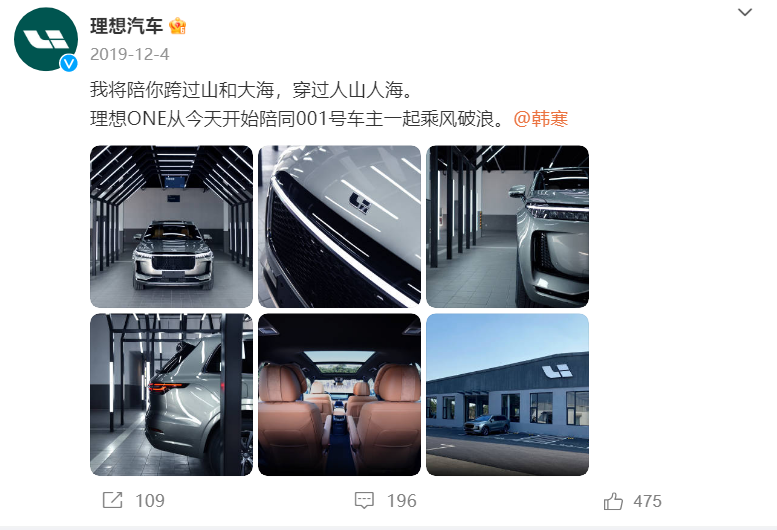 蔚来首款车型ES8,2018年5月量产,理想首款量产车型ONE下线,已经是2019年11月。即便理想将编号为001的理想ONE交付给韩寒,创造了一波话题,但是跟友商的交付时间相比,晚了一年之久。