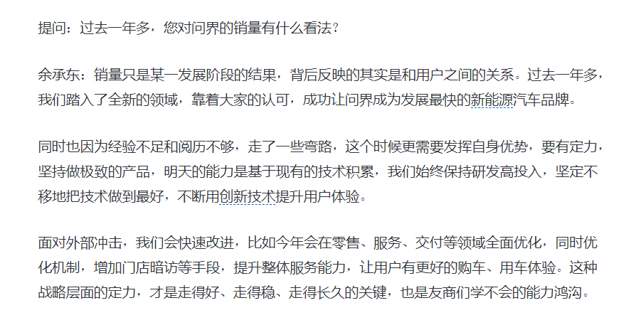这回轮到余承东公开反思了,在跟供应商、渠道商的沟通中,余承东承认问界因为经验不足和阅历不够,走了一些弯路。但也强调销量只是某一发展阶段的结果,问界在战略层面的定力,是友商们学不会的能力鸿沟。