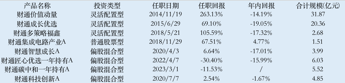 Wind数据显示,截至2023年一季度末,金梓才单独管理或与他人共同管理8只产品,合计规模为76.81亿元。在管产品多数今年年内回报不佳,多只跌超15%,仅财通集成电路产业A年内取得4.77%正收益。
