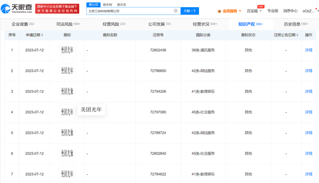 天眼查App显示,近日,美团关联公司北京三快科技有限公司申请注册多个“美团光年”“美团光象”商标,国际分类为教育娱乐、广告销售、科学仪器等,当前商标进度均为申请中。今年6月29日,美团于香港联交所发布公告称,已完成光年之外境内外主体100%股权的收购,收购价约为20.65亿元。(天眼查)