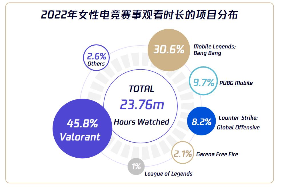Esports Charts数据显示2022年女性电竞赛事全年产生了2376万小时的观看时间,较2021年增长了1.5倍。如图所示,《无畏契约》45.8%和MLBB30.6%占据绝对的主导。