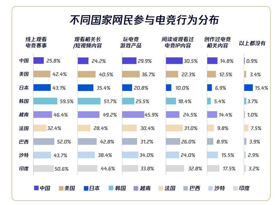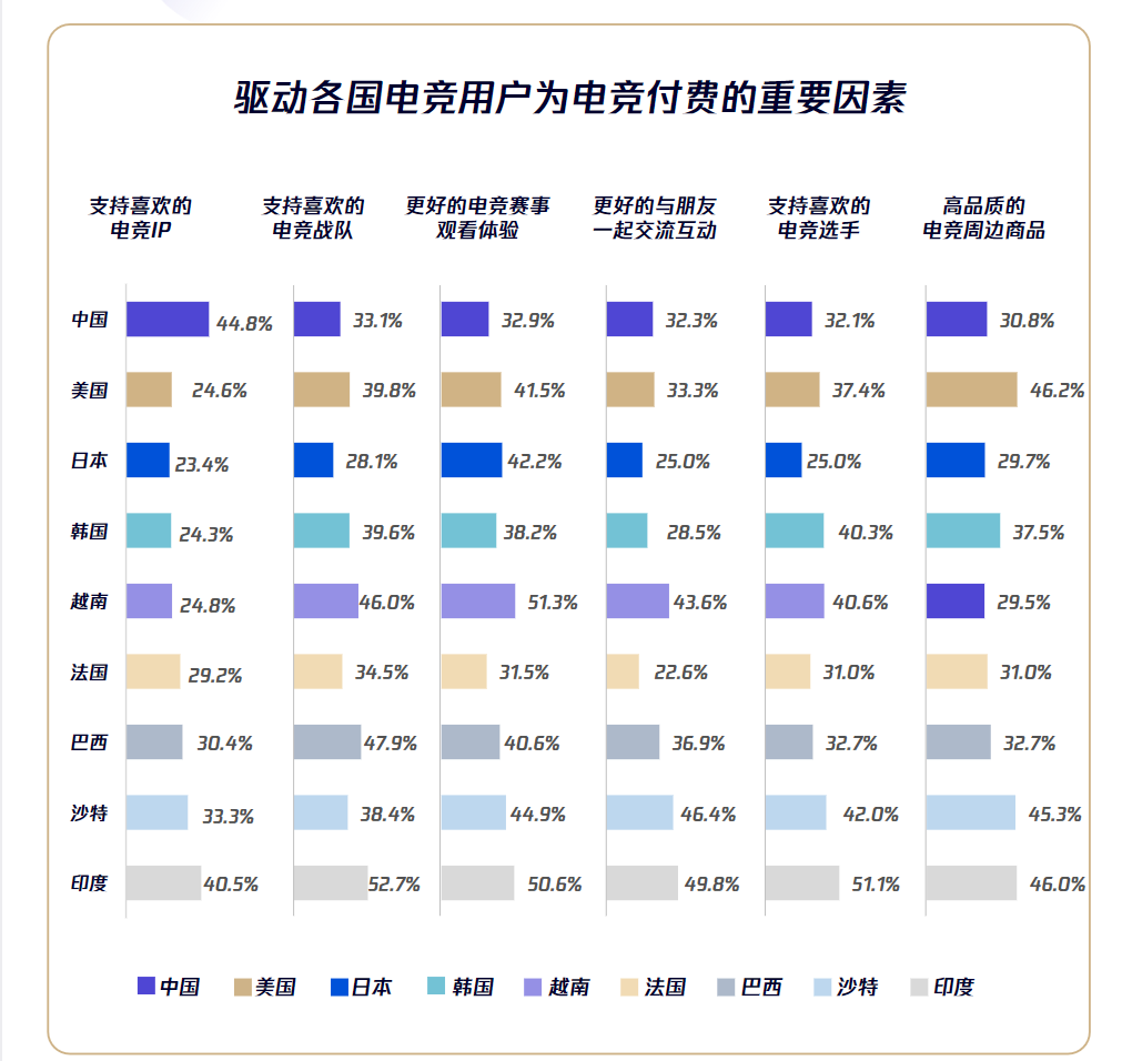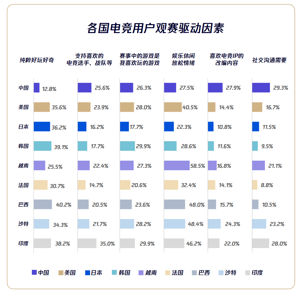 通过对比可以发现,如果说美国、印尼、韩国电竞用户欣赏赛事目的是最高序列,中国电竞的发展和用户已经变成以电竞IP扩撒为主,赛事体系是目前内容生态的基础环节。