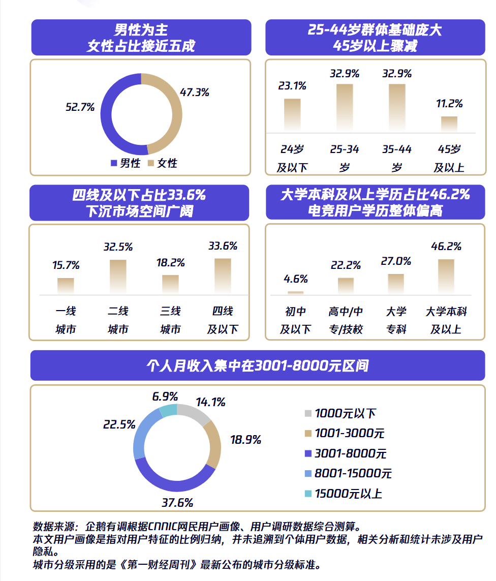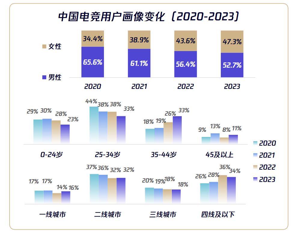 无论是2022年全球女性电竞赛事观看时长相较2021年增长1.5倍,还是2020-2023中国电竞用户画像中女性占比从34.4%增至47.3%,都表明电竞用户增长放缓进入存量市场后,关注女性市场会为电竞带来更多机遇。