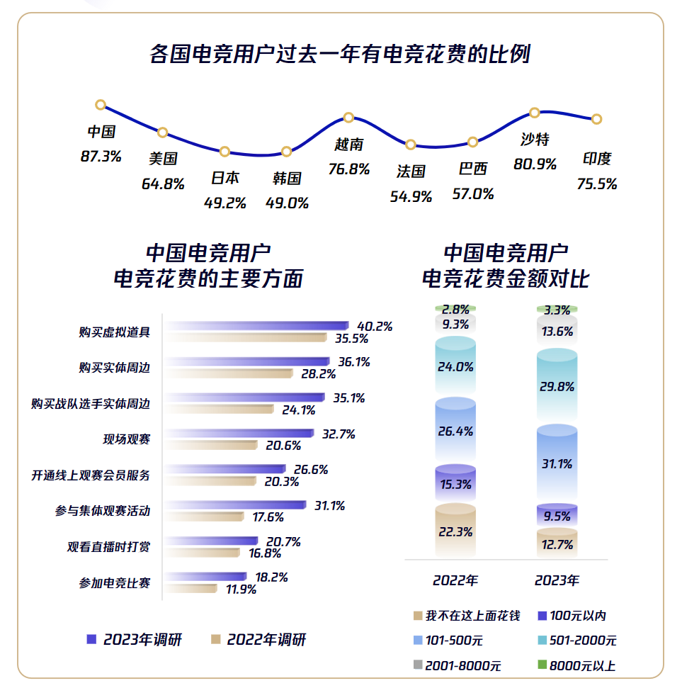 消费倾向同样如此,付费意愿相比2022年调研增加9.6%至87.3%,同样还是以支持喜爱的电竞IP为主。
