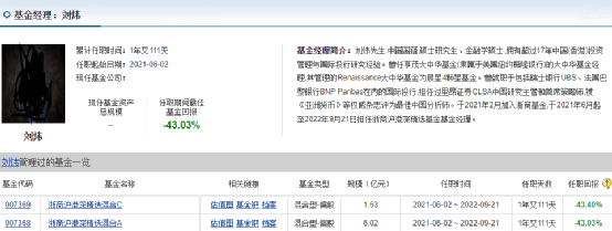 据天天基金网,刘炜并未单独管理过浙商沪港深精选基金,而是于2021年6月也就是其入职浙商基金后四个月,开始与另一位基金经理共管产品。