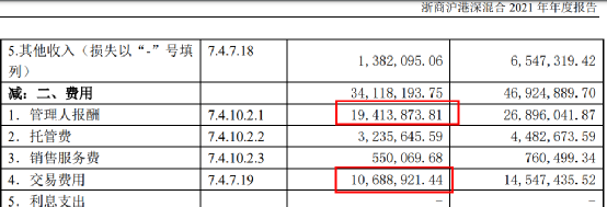 值得注意的是,上图中还有一项“交易费用”项目,通常为买卖证券产生的费用,2021年超过千万元。