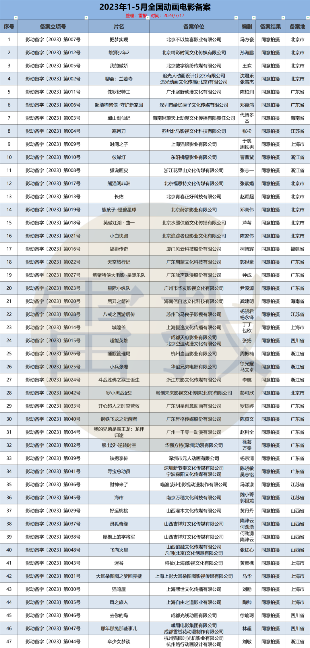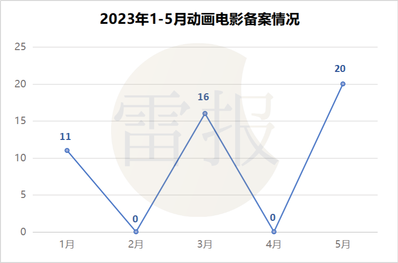 7月10日,国家电影局发布了关于2023年5月下全国电影剧本(梗概)备案、立项公示的通知。雷报通过进一步的整理和统计获悉,2023年1月至5月,全国电影剧本(梗概)备案、立项通过影片中,动画电影共备案47部,其中1月共11部,3月共16部,5月共20部,2月、4月没有动画电影备案。