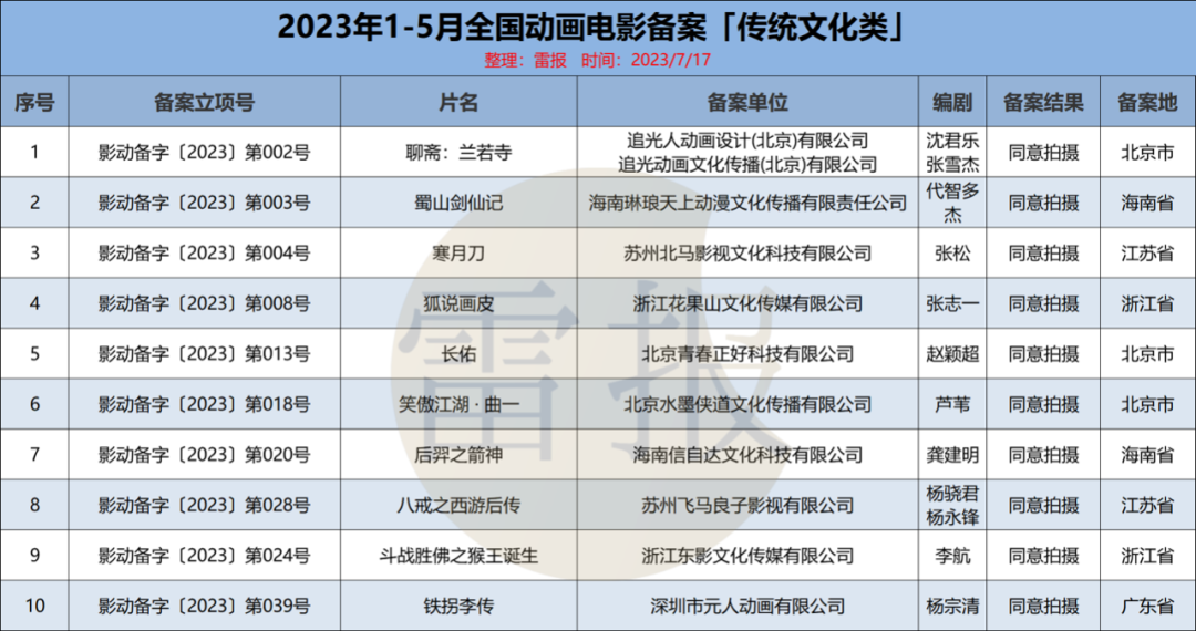 雷报曾统计,自2015年以来共有超过千部动画电影备案,其中包括但不限于“26个孙悟空”、“12个哪吒”和“13个二郎神”等等。雷震子,妈祖(林默)、李冰等神话人物都曾改编成为动画电影人物。如今,传统文化题材进一步扩充,除上述提到的神话题材外,武侠、志怪题材的作品也陆续亮相。1-5月备案电影中,有至少10部作品属于传统文化类题材,包括神话题材《长佑》、《后裔之剑神》、《八戒之西游后传》、《斗战胜佛之猴王诞生》、《铁拐李传》,聊斋志异改编的志怪题材《聊斋:兰若寺》、《狐说画皮》,传统武侠题材《蜀山剑仙记》、《寒月刀》等。此外,《彼岸灯》、《城隍爷》、《好运桃桃》等作品虽然不属于严格意义上的文化题材作品,但也与传统文化相关,或带有传统文化元素。