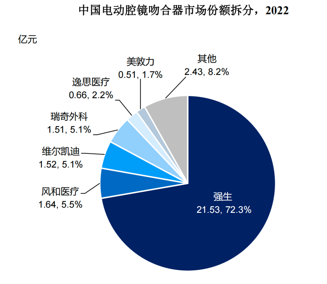 根据弗若斯特沙利文出具的《微创外科手术器械市场研究报告》,2022年,中国电动腔镜吻合器市场中,风和医疗位列前三,约占中国电动腔镜吻合器市场的5.5%。而强生占据了该市场的大部分“蛋糕”,市占率72.3%。