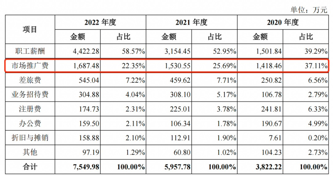 其中,市场推广费金额较高,报告期内,公司市场推广费分别为1418.46万元、1530.55万元和1687.48万元,占当期销售费用的比例为37.11%、25.69%和22.35%。