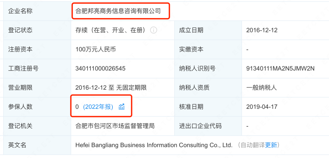 企查查显示,合肥邦亮成立于2016年,参保人数为0,疑似一家“空壳”公司。
