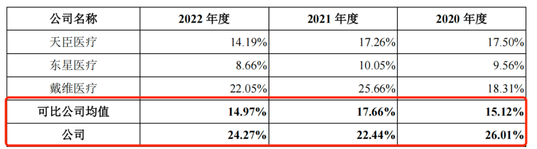 而同行可比上市公司天臣医疗、东星医疗和戴维医疗的销售费用率平均值分别为15.12%、17.66%和14.97%,风和医疗的销售费用率远高于同行公司。