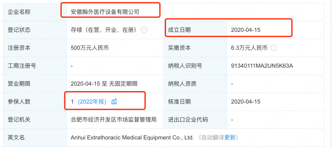 企查查显示,安徽胸外的参保人数为1,很有可能也是一家“空壳”公司。