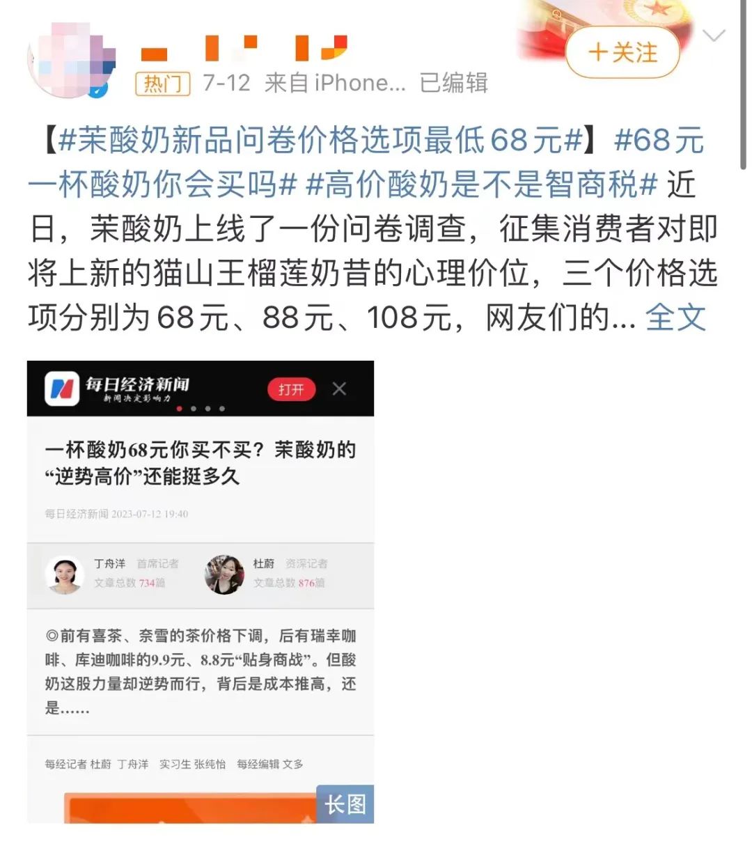 比如前几天,茉酸奶因为猫山王酸奶最低68元,最高128元,仅仅让网友做价格投票,就被推上风口浪尖。