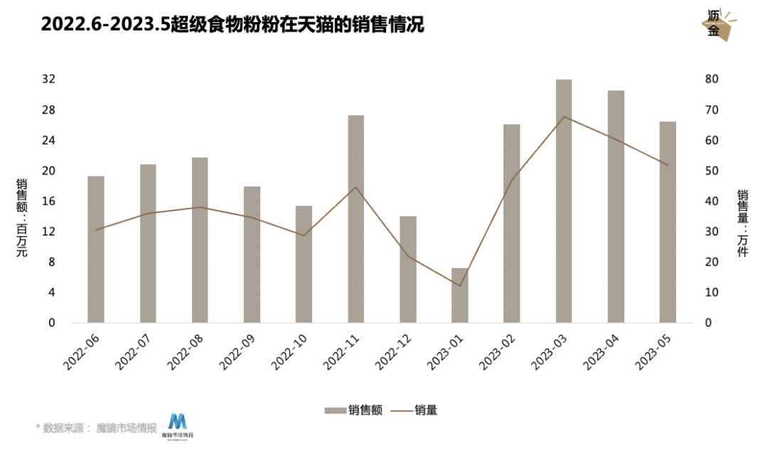 2022年6月-2023年5月期间,超级食物粉在天猫的销售额达到2.6亿元,同比增长463.9%;销量达到472.3万件,同比增长466.3%。