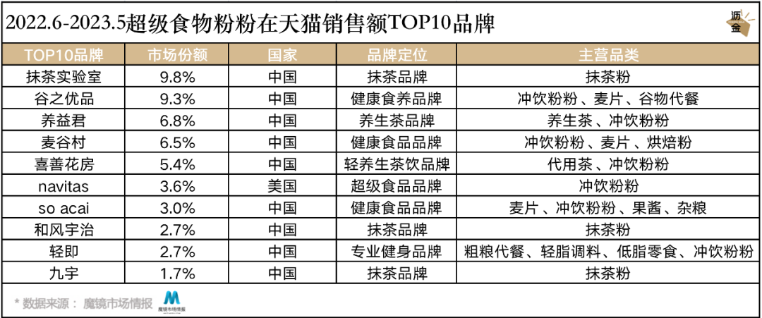 TOP10品牌中有多个抹茶粉专营品牌上榜,抹茶粉因其抗氧化、促代谢等功效也“蹭”了一波超级食物的热度。