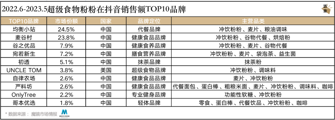 另外,均衡小站和麦谷村各占据抖音该品类20%以上的市场份额。均衡小站除各类超级食物粉外,还售卖麦片、有机油等食谱产品套组:而麦谷村除超级食物粉,其他品类则是围绕谷物这一概念进行延伸,热销产品有烘焙粉和谷物代餐。