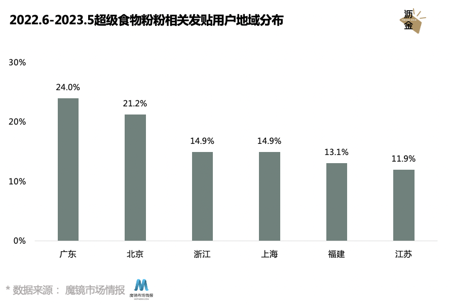从地域来看,相关内容发贴用户来自广东的占比最多,北京、上海两大一线城市均上榜。由此可见,一线城市消费者是超级食物粉的主力受众。
