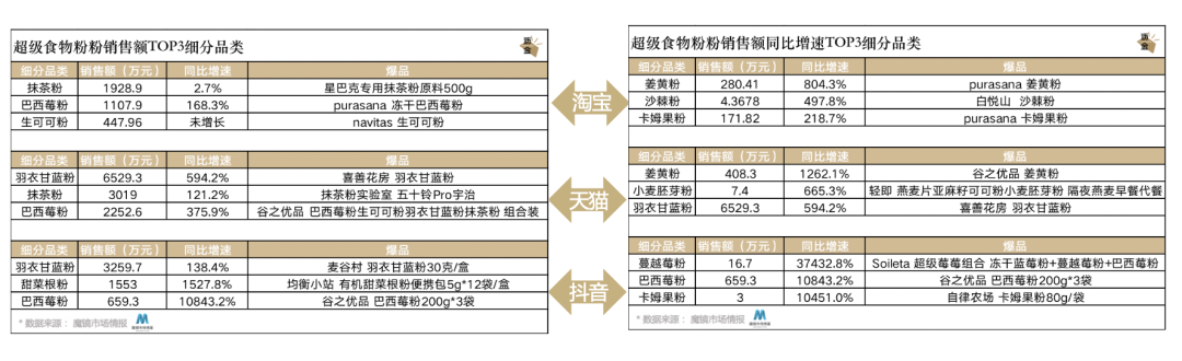 超级食物粉TOP3细分品类销售额及增速