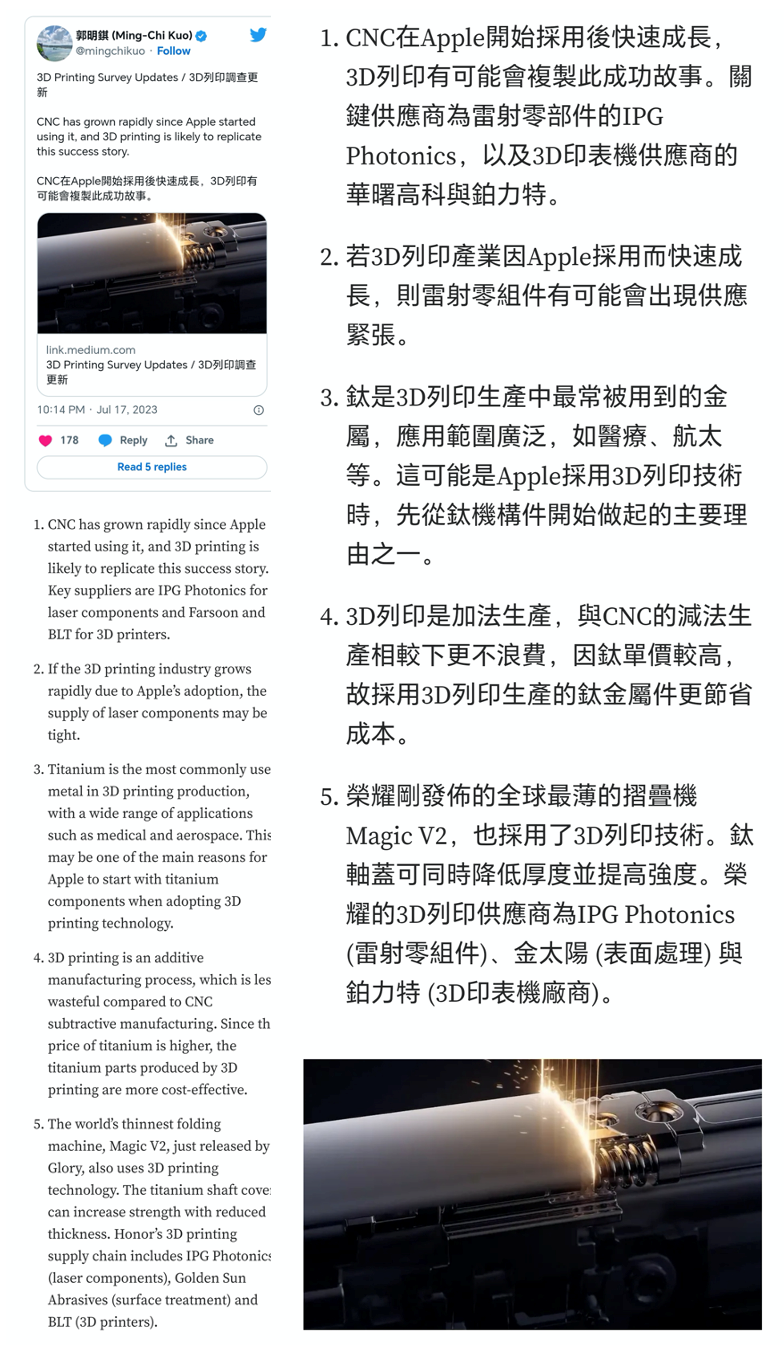 在此之前,3D打印的钛合金零件虽被广泛地应用在航空航天、医疗等领域,但在3C行业却未曾有过突破。而此次荣耀Magic V2正是3D金属工艺结构件在手机上的第一次大规模使用。笔者认为,随着苹果、华为等头部厂商的进一步跟进, 3D打印技术必将向产业化、规模化迈进,加速钛合金3D打印技术的普及发展,相信电子消费品也将迎来一场新的革命。