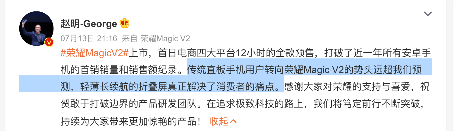 回顾荣耀三年独立之路,会发现荣耀之所以能够不遗余力攻克这些技术,让创新实现从量变到质变的突破,重要的核心在于其始终将用户的需求放在第一位,以及坚持长期的研发投入。在行业下行时,荣耀也依然反周期加大研发力度,每年拿出营收的10%用于研发,以战略投入的确定性,来面对市场的不确定性。如今,荣耀旗舰产品的用户中目前已经有将近15~20%来自iPhone用户,相信随着荣耀Magic V2的开售,荣耀旗舰将会进一步抢占苹果高端市场份额。