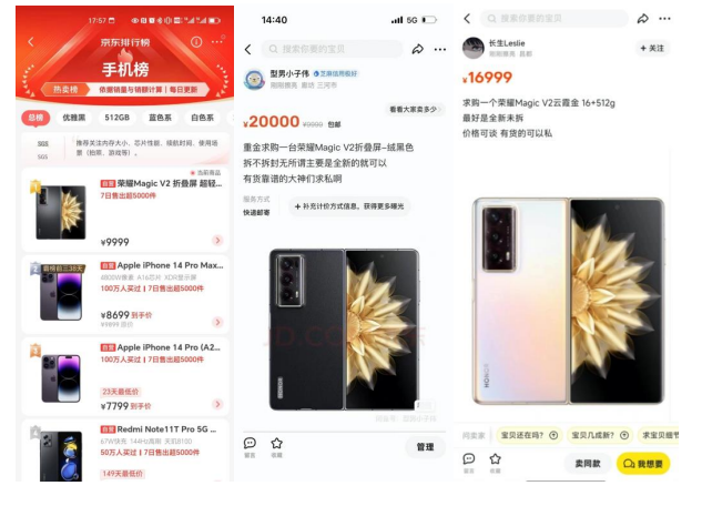 从预售阶段表现来看,荣耀Magic V2展现了“荣耀风暴效应”:预售12小时内,电商四大平台预售数据打破了近一年包括直板机在内的所有安卓手机预售的销量和销售额纪录;在京东平台上,荣耀Magic V2刚开启的数分钟,抢订台数就突破了1W+,要知道这可是8999起步的手机,这样的数据成绩已相当不错了。除京东外,其余多家电商平台都出现抢订潮,需排到9月份才有货。与此同时,二手交易平台上,荣耀Magic V2更是出现了将近万元的溢价,火热程度可见一斑。