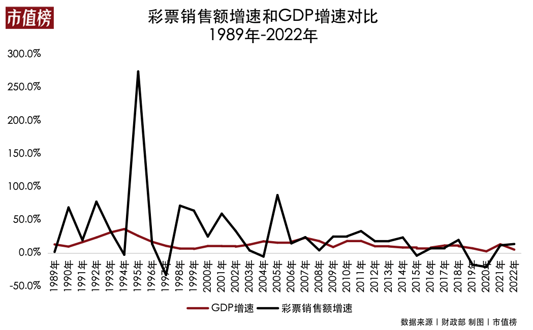 中国有彩票的36年时间,彩票销售额的年平均增速是22%,GDP的年平均增速是13%。