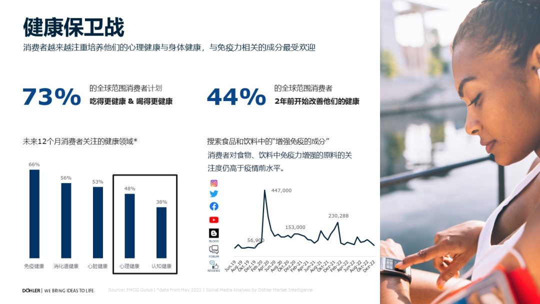 我们看到两组数据:73%的人已经意识到要吃得更健康、喝得更健康,44%的人已经采取行动,希望改善自己的健康情况。
