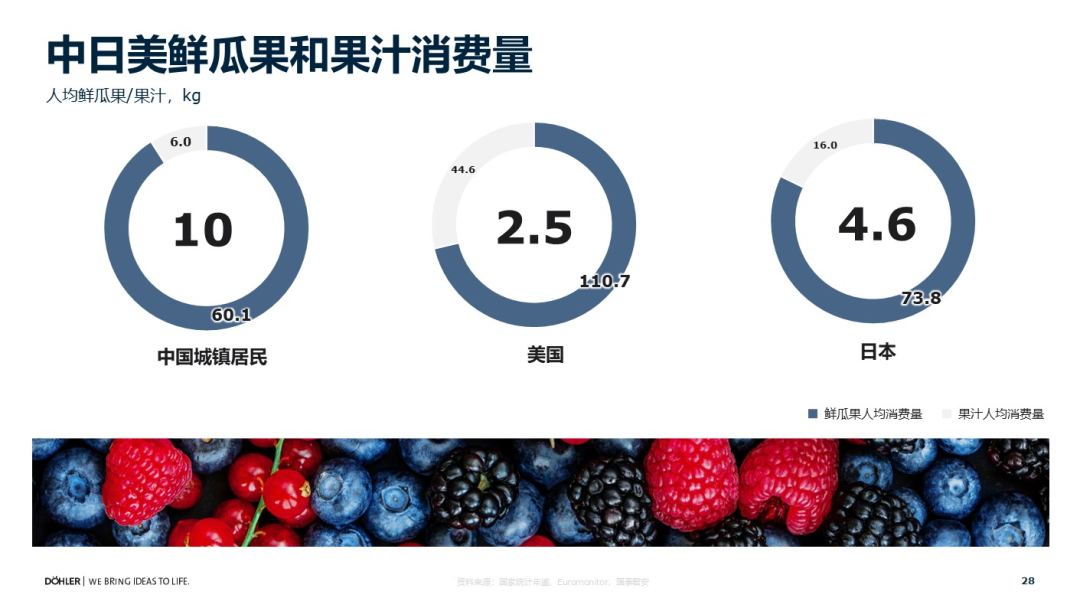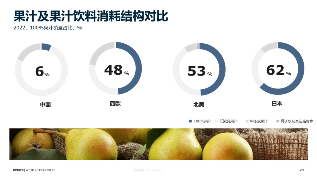 我们看一下果汁的消费比例:大家喝的果汁当中,只有不到6%是100%果汁。这个比例在西欧是48%,北美是53%。很多食品饮料创新的品牌、新茶饮刚起步时都在学习日本的市场,而日本的比例是62%。