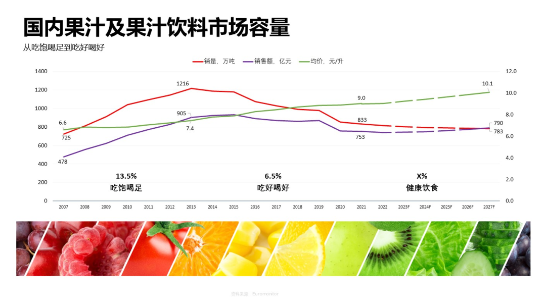 我们认为中国果汁第一个发展阶段是在2007年到2013年,中国人均可支配收入以每年13.5%的速度上涨。大家口袋鼓起来了,手里有更多可以花钱的地方,这个时候是工业饮料发展更快的时候。而中国果汁市场在这个阶段高速发展,红色和紫色曲线是快速上升的。但是在这个阶段,尽管销量上升,整个时代还是流行低质、低价的。