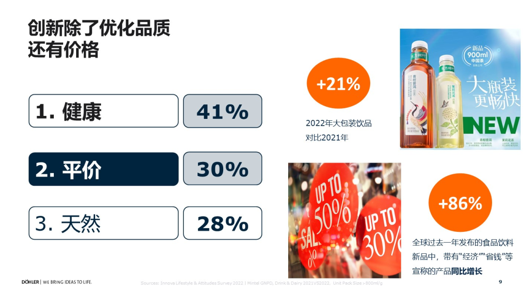 全球的创新以往总是围绕着健康、功能、优化产品的品质来进行,而最近几年的创新很大一部分是围绕着价格进行,企业开始思考怎样在保证产品品质的同时让价格不再成为消费者的负担。在这里也有两组数据和大家分享: