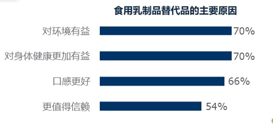 第二个是植物基,植物基是一个很大的趋势。我们在全球调研中发现,几乎每两个消费者中就有一个消费者说我可以不吃肉或者少吃肉。另外一组调研则更加有趣,当更深入地去了解消费者为什么选择植物基产品时,我们发现在消费者选择乳制品替代品的主要原因中,有70%的消费者认为这样做“对环境有益”和“对身体健康更加有益”。这代表有很大一部分人群愿意做一个对社会有贡献的人,也有很多人认为吃植物基的产品对身体更好;而排在三四名的分别是“口感更好”以及“更值得信赖”。这四个因素加在一起主导了消费者心智。