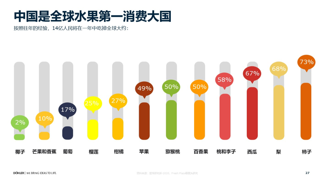 首先是第一组数据。不知道有多少人了解中国其实是全球最大的水果消费国,中国很多水果的消费量占了全球的50%,甚至更高的比例。当然有两种水果比例偏低——椰子和榴莲。但我相信随着中国这两年网购的发展,尤其东南亚关税政策的减免,椰子和榴莲的消耗比例很快就会增加。