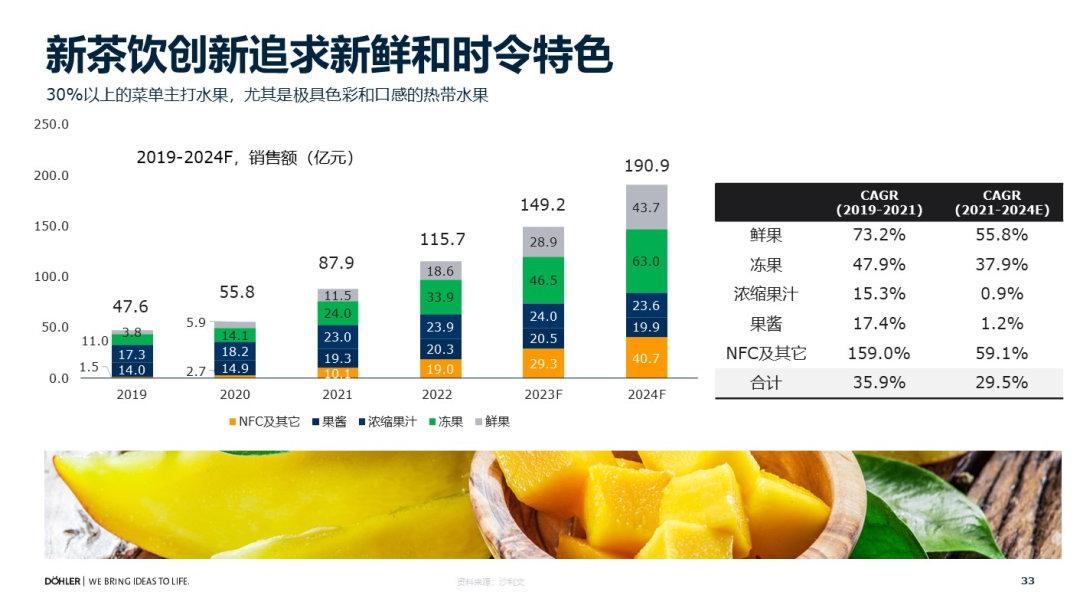 在新茶饮这个热门赛道中,冻果(图中绿色)和NFC及其他果汁(图中橙色)呈高速增长的趋势,我们认为整个趋势性变化会继续保持。