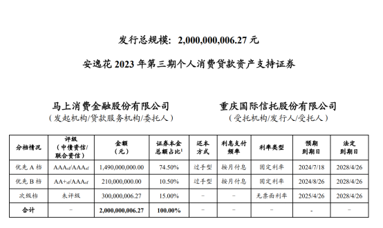 持牌消金公司发行ABS的步伐在提速。7月18日,马上消费金融股份有限公司(以下简称“马上消金”)公布了《安逸花2023年第三期个人消费贷款资产支持证券发行公告》(以下简称《公告》)等相关材料。