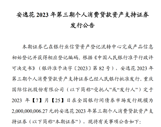 《公告》显示,安逸花 2023 年第三期个人消费贷款资产支持证券已经央行批准发行,发行时间为2023 年7月25日,地点为全国银行间债券市场,发行规模约为20亿元。