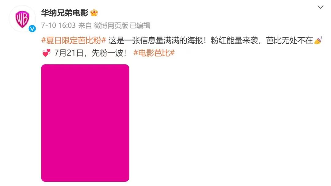 华纳电影公司的微博头像从原来的蓝黄色变成了粉色,就是为了给电影《芭比》在中国上映造势。