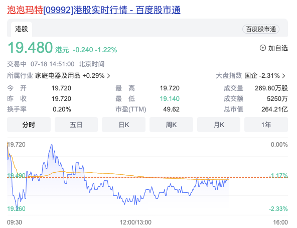 然而,截至7月18日盘中,泡泡玛特每股报19.48港元,总市值仅264.21亿港元,相比2021年已经缩水了千亿余港元。