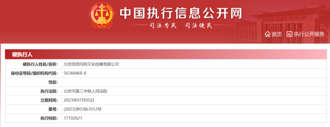 中国执行信息公开网显示,7月5日,北京泡泡玛特文化创意有限公司新增一则被执行人信息,执行标的约1710万元,执行法院为北京市第三中级人民法院。