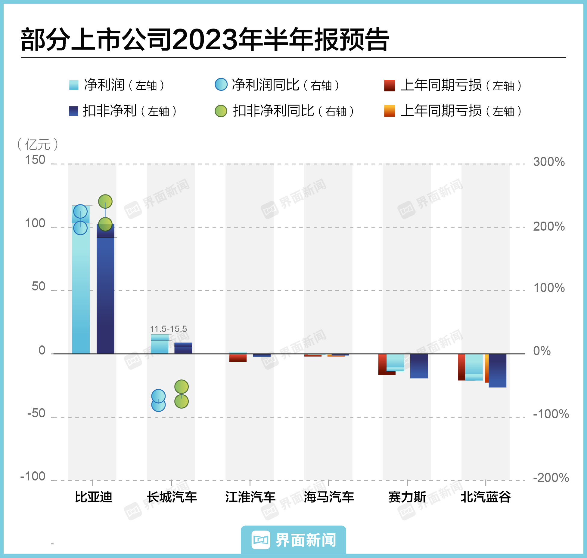近日,多家上市汽车公司披露了2023年上半年业绩预告。据界面新闻统计,主流乘用车汽车品牌中,比亚迪盈利能力最强,预计报告期内盈利105至117亿元,较上年同期提升192.05%至225.43%;北汽蓝谷预计亏损额度最大,预计今年上半年净利润亏损18至21亿元。长城汽车业绩大幅下滑,预计今年上半年净利润为11.5亿元至15.5亿元,同比下滑72.32%至79.47%;扣非净利润6亿元至8.5亿元,同比降低58.71%至70.86%。