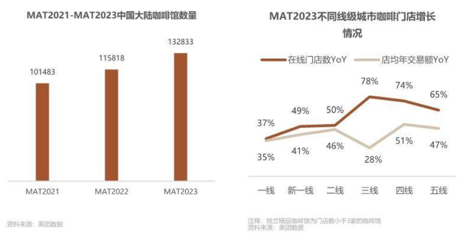 第一财经商业数据中心和美团发布的《2023中国城市咖啡发展报告》显示,MAT(月滚动年销售趋势)2023年,在线门店数增长最快的是三线、四线和五线城市,分为为78%,74%和65%。