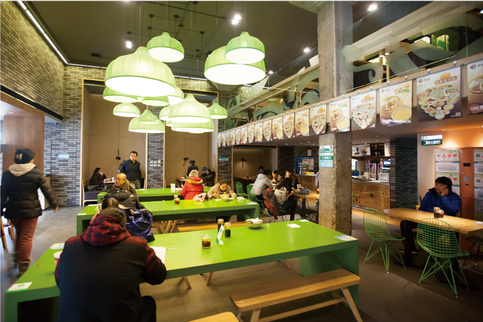 新店不再使用浓重的红色,而以清新的绿色为主色调,打造轻松愉快的用餐氛围。空间布局参照美国汉堡品牌“BER”,装饰面材料加入中国的本土元素,试图讲述李先生面馆从60年前中国建国到台湾、美国以及世界各地,最后回到中国的故事,为消费者呈现过去时代生活的缩影。
