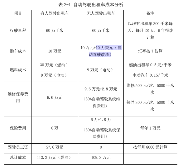 麦肯锡的研究认为,与电动出租车相比,Robotaxi改装成本需控制在10万美元左右,才能迎来成本的拐点。