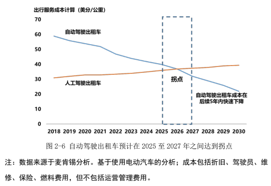 对此,麦肯锡预测,随着技术进步,Robotaxi成本还会快速下降,与传统出租车成本相比,将在2025至2027年之间达到拐点。而研报《自动驾驶应用场景与商业路径》也预计,2025年左右,Robotaxi取消安全员并规模化部署后,相关人力成本大为较少,其成本优势才会凸显,将带来出行服务的颠覆。