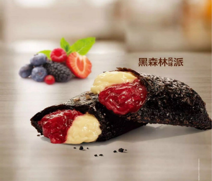 在圣诞季来临前,麦当劳中国推出了一款叫“黑森林”的风味派,按照官方介绍,包含了可斯达和混合莓果。可斯达是一种常见的蛋黄奶油酱,常填充于泡芙等甜品中。派皮被做成了黑色,混合着红色莓果和黄色蛋黄,这口感也是略让人期待。