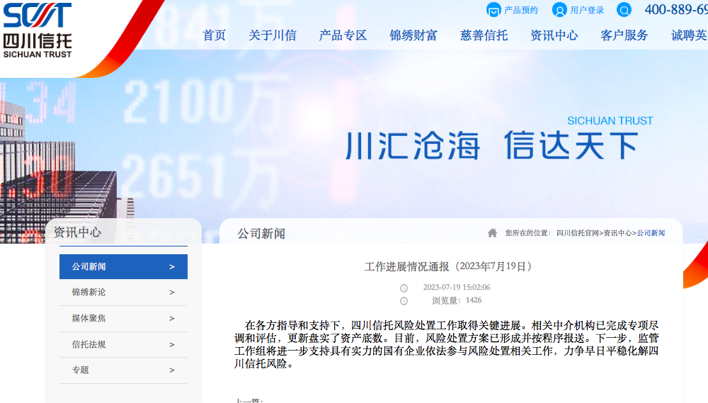 7月19日,四川信托在官网发布工作进展情况通报称,在各方指导和支持下,四川信托风险处置工作取得关键进展。相关中介机构已完成专项尽调和评估,更新盘实了资产底数。