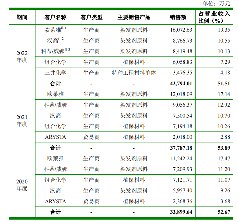 招股书显示,2020-2022年期间,欧莱雅一直为TOP1客户;科蒂/威娜一直为前三客户;汉高、组合化学,一直在前五客户之列。其中,2022年,欧莱雅、汉高、科蒂/威娜依次为鼎龙科技TOP3客户,所贡献的销售额分别为1.61亿元、0.88亿元、0.84亿元,占营业收入的比重分别为19.35%、10.55%、10.13%。