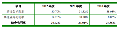 不过,尽管业绩表现可圈可点,但该公司毛利率已连续三年下降。据招股书显示,2020-2022年期间,鼎龙科技综合毛利率分别为37.86%、31.04%和30.62%,主营业务毛利率分别为38.08%、31.32%和30.70%。鼎龙科技表示,公司产品的毛利率变动主要受原材料价格波动、市场需求变化及市场竞争格局变化等因素影响。