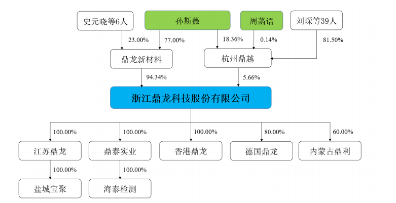 截至最新招股书签署日,公司的控股股东为鼎龙新材料,其持有公司94.34%的股份;实际控制人为孙斯薇、周菡语,其中,孙斯薇持有鼎龙新材料77.00%的股权并担任执行董事,持有杭州鼎越18.36%的出资份额并担任执行事务合伙人,其通过控制鼎龙新材料、杭州鼎越合计控制公司100%的股份。周菡语系孙斯薇之女,持有杭州鼎越0.14%的出资份额并担任发行人董事。