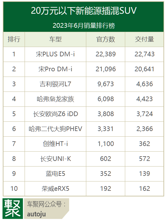 就20万以下的新能源插混SUV来看,宋氏二兄弟稳霸冠亚军,各以2万多的销量形成绝对优势。银河L7以4636辆的交付量,跟在其后。